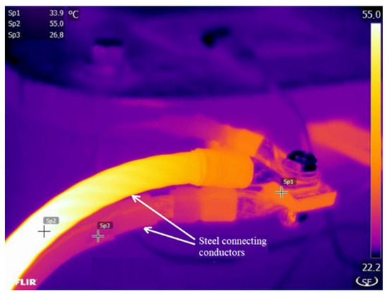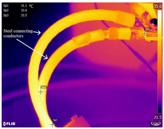 For the third case, in which the connection between the impedance bond terminal and the railway rail is made by means of two steel connecting conductors, the thermographic image captured by the thermal imaging camera is shown in Figure 16.