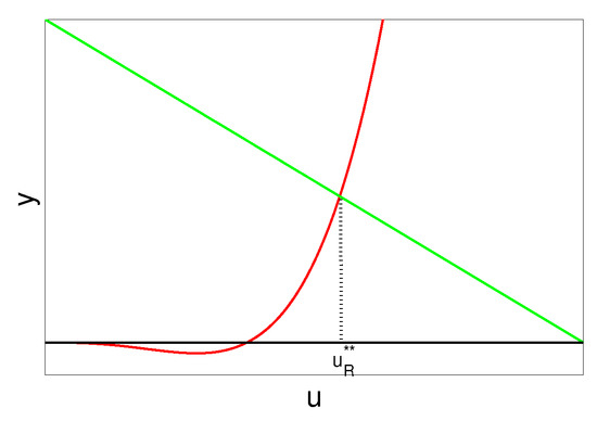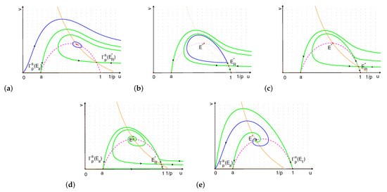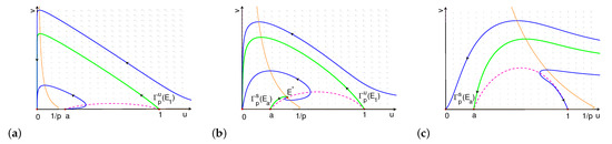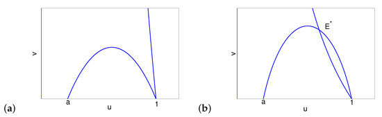 When increases to 1, v-nullcline and u-nullcline intersect at , with the slopes of tangents at being and , respectively. If , collides with when , is in the forth quadrant, and there is no interior equilibria (see Figure 1a). Moreover, when , there is no interior equilibria. If , (sitting in the forth quadrant when ) collides with when , and there is a unique interior equilibrium in the first quadrant (see Figure 1b). When and close to 1, moves into the first quadrant, and there are two interior equilibria and . If goes on to decrease, there exists a , such that the u-nullcline and v-nullcline tangent at , where and collide, and there is a unique interior equilibrium . When , there is no interior equilibria. □