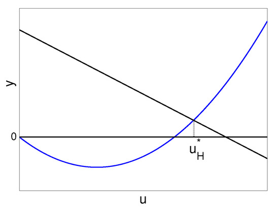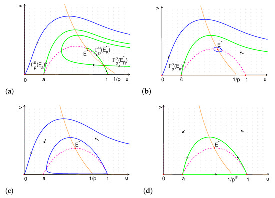 In fact, when , two nullclines have two intersections: in the first quadrant and in the forth quadrant. Thus, there is a unique interior equilibrium with and satisfying (5). When decreases to a, collides with , and is still in the forth quadrant. When , moves into the forth quadrant, leaving no interior equilibria.