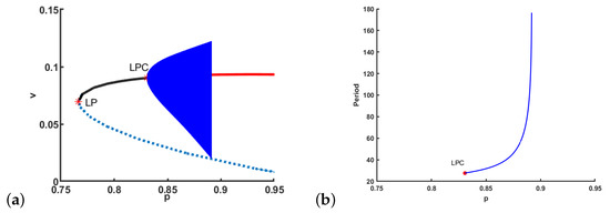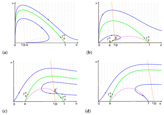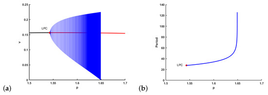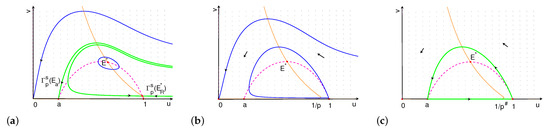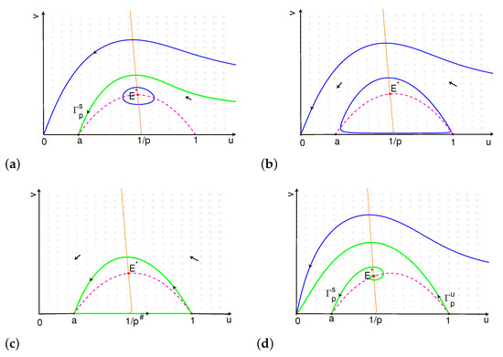When there is no cooperative hunting in predator, i.e., , the v-nullcline is , which is vertical. The system undergoes a Hopf bifurcation near when , which is the top of the u-nullcline . In fact, it has been discussed widely that the stability of positive equilibrium can be stated graphically by the u-nullcline when the v-nullcline is vertical: is unstable if the v-nullclines intersect to the left of a local maximum of the u-nullcline, and stable if they intersect to the right [29,58,59,60], and thus, Hopf bifurcation occurs at the “top of the hump” of u-nullcline. However, for system (7) in this paper, the v-nullcline is not vertical, and we can verify that the intersection of the u-nullcline and the v-nullcline corresponding to the Hopf bifurcation point is on the right of the “top of the hump" of u-nullcline. In fact, the “top of the hump” of u-nullcline achieves at , at which the corresponding value of p is denoted by . When , can be also proved to be unstable. Comparing the results in systems with and without cooperation, we can conclude that cooperative hunting is more likely to bring instability into .