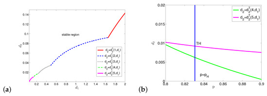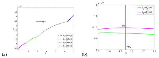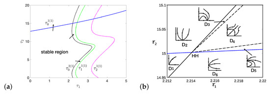 When , , and has two roots. The crossing set , which is shown in Figure A5a. We can get the stability switching curves , which are shown in Figure A5b. Thus all the stability switching curves for are given by .