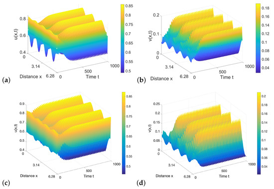 In fact, the preys and predators distribute inhomogeneously in different locations, and the spatial diffusion plays an important part in the process of population evolution. Turing instability and Turing–Hopf bifurcation induced by diffusion have been widely investigated recently (see in [31,32,33,34]).