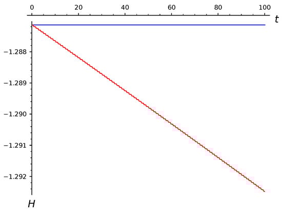 Choreographic test, step . Dependence of energy H on time for the approximate solutions found using the midpoint scheme (blue) and the rk4 scheme (red).