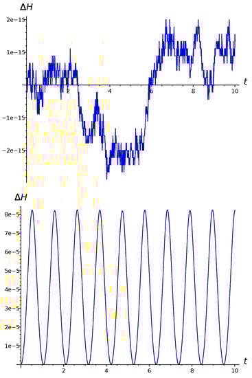 To preserve the changes in the integrals at the round-off error level, one can use difference schemes that do not exactly preserve the integrals but preserve them up to the terms whose order in the step  is much higher than the order of the scheme itself. These schemes include the large family of schemes implementing the Hamiltonian boundary value methods  []. Within this approach, the energy of a Hamiltonian system is not exactly conserved, but in any given order of approximation in  ([], th. 3.4). Moreover, as shown in a number of numerical experiments with periodic solutions ([], § 4.4), the total energy variation fluctuates within the round-off error without a noticeable trend towards dissipation or anti-dissipation. This circumstance favorably distinguishes this class of schemes from explicit Runge–Kutta schemes, in which the energy usually monotonically increases or decreases.