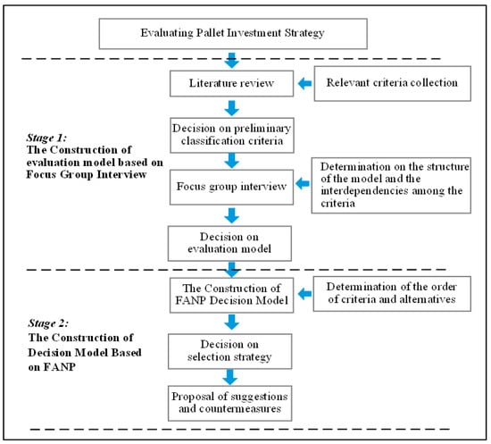 A focus group and the FANP were used to assess the significance of the pallet investment strategy in the supermarket supply chain system of this research. The research process can be divided into two parts. The first stage was “The Construction of Evaluation Model Based on Focus Group Interview”. First of all, the evaluation criteria of logistics facilities, equipment, and resources—such as operational efficiency, cost and economic value, use, and durability—were searched for I the relevant literature to serve as the basis for the discussion of the focus group. Then, according to the classification criteria of the preliminary decision, an expert group was formed to determine the hierarchical relationship and interdependence of each criterion and then determine the evaluation model of the integration strategy. The second stage was “The Construction of Decision Model Based on FANP”. The evaluation model based on the decision of the first stage was based on the FANP decision model used to evaluate the criteria and alternatives. Finally, based on the analysis results, specific suggestions and countermeasures were formulated. The research framework is shown in Figure 1.