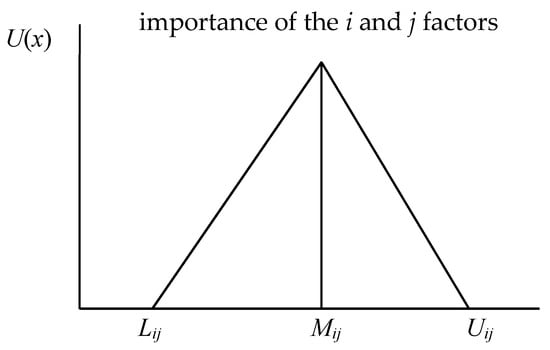 Saaty [23] believed that the geometric mean was more effective for expressing expert consensus, and the geometric mean has been commonly adopted in practical applications. Thus, the geometric mean (representing the consensus of most experts) was taken as the mode of triangular fuzzy number in this study, i.e., the degree of membership was set to be equal to the mean of one. In Figure 2, Uij is the upper limit (maximum) of expert consensus, Mij is the geometric mean representing the majority of expert consensus, and Lij is the lower limit (minimum) of expert consensus. That is, the value between Lij and Uij represents the possible consensus views. The geometric mean was used in this paper for the model of triangular fuzzy numbers. The TFN equation is shown in Equations (1)–(4). TFN can be determined as follows [31]: