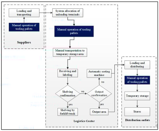 Enterprise A is the largest supermarket chain enterprise in Jiangsu province and one of the top four fast-moving consumer goods retail enterprises in China. With rapid logistics, it provides a wide variety of commodities, such as food, vegetables, beverages, household goods, hardware, and appliances for supermarkets in many regions. As a regional storage center, the logistics center is mainly responsible for the supply and distribution of stores in the region. The distribution model adopts the mode of three deliveries a day, and the goods needed for stores are appropriately replenished. As long as the amount of goods in the logistics center is lower than that of the safety stock, the information can be instantly shared with the supplier through the system and the purchasing department can place an order. This can enable the proper replenishment of stock to provide enough goods for stores. In this model, each batch of ordered goods in the logistics transfer process of the supply chain is classified and moved from the supplier to the logistics center, and then the logistics center distributes the goods from the existing inventory to the stores in batches. To ensure the smooth transfer of goods, the logistics center needs to manually assemble tooling pallets many times during the process of the input and output of the goods (Figure 3) for the non-standard logistic and transportation equipment of suppliers, logistics centers, and stores. For example, pallets must be replaced in centralized operation due to the different specifications of the shelves of warehouses and vehicles. This often results in the following inconveniences.