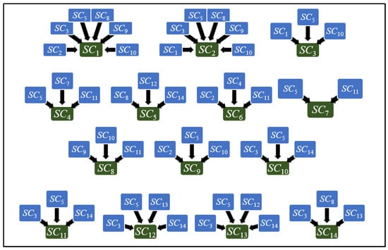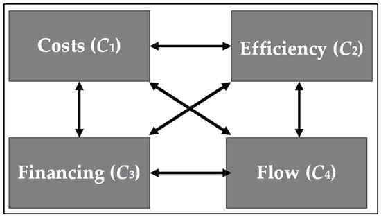 In this study, the consistency of expert opinions was summarized twice after two meetings. The first meeting mainly discussed the 58 initially collected criteria, and then the experts expressed their opinions on the importance of each criterion and finally constructed the hierarchical structure of this paper. The main questions discussed included whether maintenance costs are important to resource (pallet) sharing and the future development prospects of the supply chain system. According to such questions, a preliminary vote was taken first, questions with more than half of the voting results were reserved, and then the second round of voting and discussion was carried out. Each expert was able to fully express their opinions, and, finally the expert opinions were collected and analyzed by the intermediary after the meeting to facilitate the development of the second meeting. In the second meeting, the intermediaries provided the final confirmation to the experts based on the analysis results of the previous meeting and finalize the hierarchy of the evaluation model. The hierarchy of the evaluation model was mainly divided into 4 criteria at the first level, 14 sub-criteria at the second level, and 3 alternative schemes at the third level, as defined in Table 1. Subsequently, the interaction between criteria and sub-criteria of these two levels was discussed. The main issues that were discussed included whether the first evaluation criterion C1 of the first level would be affected by the other three evaluation criteria. The consensus of expert opinions was summarized after the meeting. In the end, the network structure of this study was constructed. Figure 4 shows the internal dependence relation of the criterion layer, and Figure 5 shows the internal dependence relationship of the sub-criterion layer.