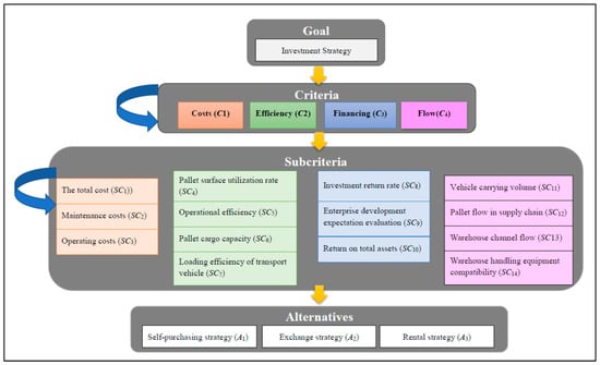 The weights of the 14 sub-criteria were ranked as follows: operational efficiency (SC5) 0.110 > investment return rate (SC8) 0.106 > operating cost (SC3) 0.102 > pallet cargo capacity (SC6) 0.098 > total cost (SC1) 0.089 > vehicle-carrying volume (SC11) 0.085 > pallet surface utilization rate (SC4) 0.082 > loading efficiency of transport vehicle (SC7) 0.076 > warehouse handling equipment compatibility (SC14) 0.073 > maintenance cost (SC2) 0.053 > enterprise development expectation evaluation (SC9) 0.046 > return on total assets (SC10) 0.034 > warehouse channel flow (SC13) 0.026 > pallet flow in the supply chain (SC12) 0.020.