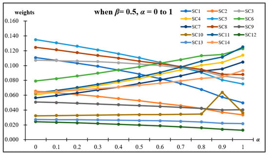 As shown in Figure 8, when β = 0.5 and α = 0 to 1, the decision makers’ preference for the future investment environment is mild (that is, between optimism and pessimism). The risk degree of the future investment environment can be simulated and analyzed from large to small by α = 0 to 1. When the risk degree of investment is the lowest (α = 0), the top five evaluation criteria are SC5, SC8, SC3, SC6, and SC1. They steadily develop until α = 0.7 and the importance changes. However, when α = 1, they no longer have the highest orders of importance; rather, they have middle orders of importance and an ectopic situation with the criterion originally ranked in the middle. The results showed that, unless there is a major investment risk (such as war or financial crisis), the results of the importance ranking of criteria will be stable in the future investment environment, which is also consistent with the results of α = 0.5 and β = 0.5.