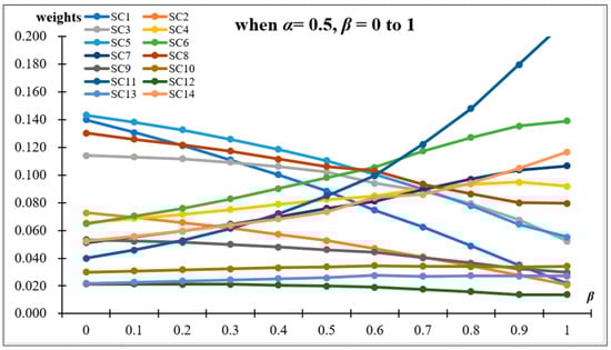 As shown in Figure 9, when α = 0.5 and β = 0 to 1, the risk of the future investment environment will be minor (which means that the future environment will be stable). We were able to simulate and analyze the decision preference of decision makers from large to small by β = 0 to 1. The results presented here are very similar to those analyzed in Figure 9, which shows that in the future investment environment, regardless of the preference of decision makers, the importance order of criteria will only change if they are extremely pessimistic, which is also consistent with the results of α = 0.5 and β = 0.5.