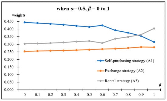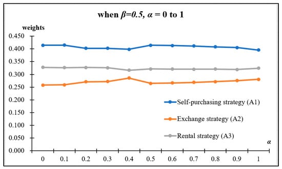 As shown in Figure 10, when β = 0.5 and α = 0 to 1 (that is, the decision preference of decision maker for the future investment environment is mild regardless of the risk of the future investment environment (α = 0 to 1)), the ranking result of the three investment strategies remained stable. The ordering result was found to be self-purchasing strategy (A1) > rental strategy (A3) > exchange strategy (A2); this is consistent with the results of α = 0.5 and β = 0.5.