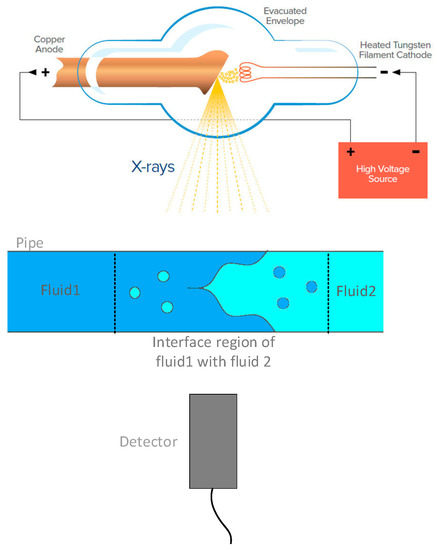 Recently, the use of X-ray tubes has been very popular with researchers because of their many benefits. The use of X-ray tubes as a source has the following advantages compared to other sources such as radioisotopes: X-ray tubes can adjust the emitted photon energy, whereas the photon emission energy is constant in radioisotopes. It should also be noted that the activity of radioisotopes decreases over time, but X-ray tubes do not follow this rule; X-ray tubes can be turned on and off. They are also easier to transport than radioisotopes. In their recent study, Roshani et al. proposed a system for monitoring fluids passing through transfer tubes [21]. Although they were able to predict the volumetric ratio of petroleum products with a MAE of less than 2.72, the use of feature extraction techniques can increase the accuracy of such systems. Much research has been conducted to measure the volume fractions of two-phase [22,23] and three-phase [24,25] flows using X-ray tubes. Researchers have claimed that the feature extraction techniques can help increase the accuracy of determining the type of flow regimes. In their study, Hosseini et al. [26] simulated a laboratory structure with an MCNP transport code in which they implemented three homogeneous, stratified, and annular regimes in different volume percentages. A cesium-137 source and a NaI detector were used in this simulation. Using the wavelet feature extraction technique combined with a neural network, they succeeded to fully recognize flow regimes and estimate volume percentages with an acceptable accuracy. In another study, Henus and colleagues implemented four flow regimes in a horizontal pipe named slug, bubble, and transitional plug–bubble flows to determine the type of flow regimes using a gamma ray absorption technique and wavelet feature extraction [27]. Further studies [28,29] have explored the applications of wavelet feature extraction in the field of radiation absorption signals.