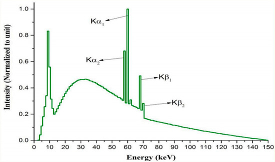 The simulation setup consisted of an X-ray tube, a pipe, and a NaI detector (Figure 1), and was performed using MCNPX [30]. A simulation of a typical industrial X-ray tube was used in this study. The real X-ray source consisted of an electron source and a tungsten target, which were mounted in an X-ray tube shield [31,32]. With the aim of reducing the simulation calculation time, a photon source inserted in the shield was regarded as a cathode–anode assembly in this investigation. The spectrum obtained from the TASMIC package [33] was also implemented to model the photon source energy. Figure 2 shows the normalized X-ray spectrum, as well as the features of X-ray peaks related to the tungsten target (Kα1, Kα2, Kβ1, and Kβ2). The circular section on the X-ray tube which was considered as the output window was 5 cm. Notably, the cylindrical form frequently shaped the X-ray tube shields, which were also made of lead or steel to prevent the emission of harmful radiation produced by X-rays.