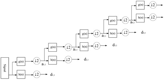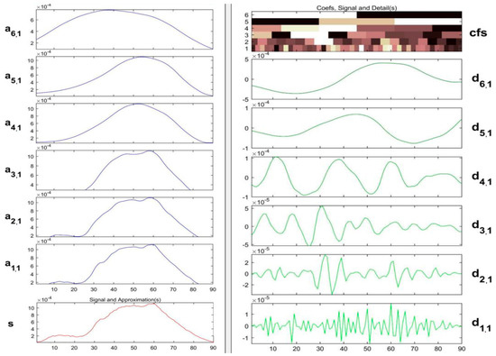 Discrete wavelet transform (DWT) is the most commonly used method in the filtering of time–frequency [34]. The reduction of additive noises by DWT provides good resolution in the frequency and time domains. Multi-resolution analysis is enabled by the DWT method by dividing the discrete signal x(n) into low- and high-frequency components. To determine DWT, an iterative Mallat algorithm can be applied [35,36]. The low-frequency component aj,k (approximately) and the high-frequency component dj,k (exactly) (Figure 3) are the results of signal x(n) decomposition with multi-level filter banks: