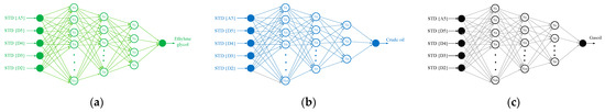 The structure of the implemented MLP neural network for prediction of (a) ethylene glycol, (b) crude oil, and (c) gasoil volumetric ratios.
