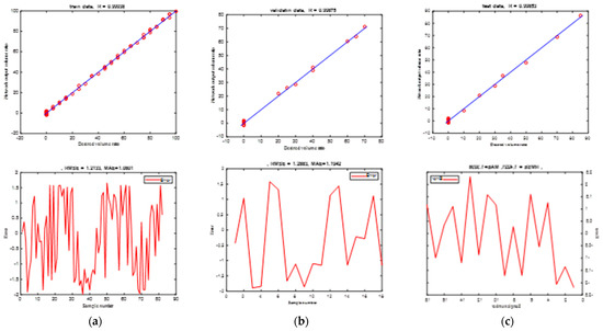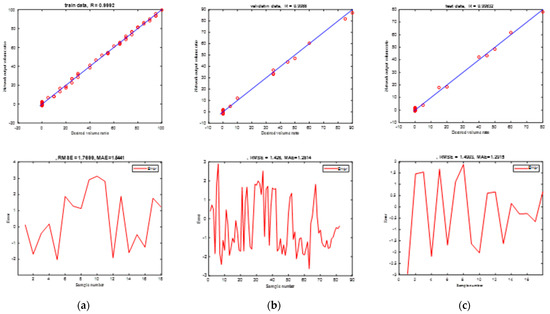 Performance of the designed neural network to determine the volumetric ratio of crude oil: (a) training data, (b) validation data, and (c) test data.