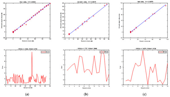 Performance of the designed neural network to determine the volumetric ratio of ethylene glycol: (a) training data, (b) validation data, and (c) test data.