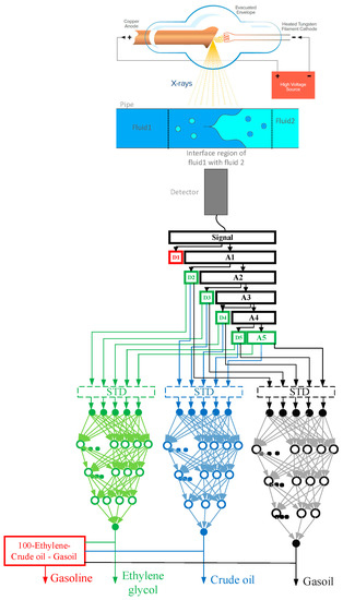 In the petrochemical industry, poly-pipelines are commonly used to transport oil or its derivatives to distribution centers. Using one pipeline to transport different petroleum fluids is very cost-effective, but the existence of problems, such as combinations of various petroleum fluids, shows the importance of developing a non-invasive method in controlling and detecting the interference region. For this reason, many types of research have been conducted, which are briefly reviewed. Salgado et al. developed a petrochemical product density detection system that included a Cs-137 source and a sodium iodide (NaI) detector [1]. The Monte Carlo N-Particle X-version (MCNPX) transport code was used in this study. Using an artificial neural network enabled prediction of the density of petroleum products with high accuracy, independent of fluid composition. They also performed a laboratory experiment to validate the Monte Carlo code, using a cesium source, a glass pipe, and a sodium iodide detector. Different volume percentages were simulated for both oil and water fluids. The volume percentages could be detected with an accuracy of 1% [2]. In other studies, researchers simulated two-phase [3,4,5] and three-phase [6,7,8] compositions at different volumetric percentages and different flow regimes. Various neural networks with different training algorithms, such as MLP [9,10], RBF [11,12], adaptive neuro-fuzzy inference systems [13], Jaya algorithms [14], and GMDH neural networks [15] were applied to predict volume percentages and flow regimes with high accuracy. In recent years, the use of feature extraction techniques such as time domain [16,17], frequency domain [18], and time–frequency domain [19] has been widely considered by researchers in this field. In all the above mentioned studies, the researchers presented different characteristics for distinguishing the type of flow regimes and determining the volume percentages. Sattari et al. used GMDH neural networks to recognize the type of flow regimes [20]. They simulated a structure including a Cs-137 radioisotope, a Pyrex pipe, and a NaI detector using the MCNPX transport code. They extracted the time domain characteristics of the recorded signal and considered them as neural network inputs. Estimation of volume percentages with a RMSE of less than 1.11 was the result of this investigation.