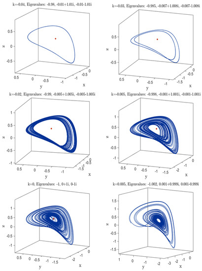 Attractors of System (1) with two different initial conditions. For the initial condition (0, −1, 0), the system tends to have chaotic or periodic attractors dependent on the parameter k. For non−positive k values, the initial condition (−0.01, 0.01, 0.01) tends to the red dot equilibrium. At the top of each panel, the corresponding eigenvalues are presented.