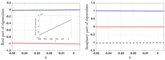 The real and imaginary parts of the three eigenvalues with different colors. Moreover, the zoomed view of two larger values of real parts is presented.