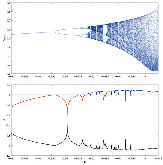 The bifurcation diagrams of System (1) versus k parameter and corresponding Lyapunov exponents for initial conditions (0, −1, 0).