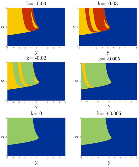 2−D cross−sections of basins of attractions of System (1). Initial conditions belonging to blue regions lead to unbounded oscillation. The yellow part contains initial conditions that show the system to its stable equilibrium. Periodic and chaotic attractors emerge from the red and green points in the y-z plane. The initial condition for the x variable is selected as x = k for all panels.