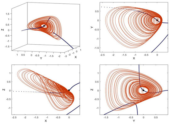 Figure 5 shows the connecting curves of System (1) for k = 0 in 3-D space and 2-D planes. The oscillator has a stable equilibrium point in . Therefore, the attractor of the oscillator is hidden for that interval of the parameter [8]. It should be noted that the connecting curves are independent of attractors, as they are calculated based on the system equations. As shown in Figure 5, the curve passes through the equilibrium; that is why these curves were nominated as connecting curves. It means that the connecting curves connect equilibria since fixed points satisfy Equation (7). As the figure demonstrates, these curves are similar to a skeleton, showing a direction that the attractor evolves around it. Figure 6 shows how the connecting curves depend on parameter k. It was shown that at different k values, the dynamics of the system change from periodic to chaotic, but the structure and direction of evolution remain the same. Accordingly, the connecting curves, which are one-dimensional set of points indicating the evolution of the attractor, do not change majorly when the k value is changed.