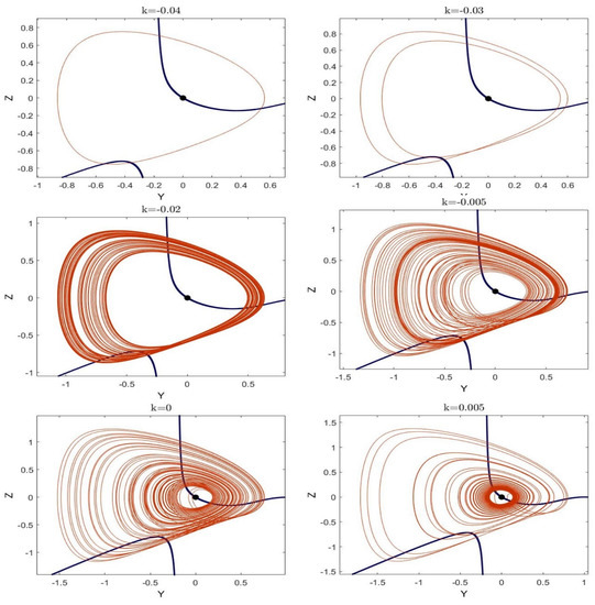 The parameter k controls the dynamics of the system to be in the different modes of oscillations. Since the oscillator has an equilibrium point in E (k, 0, 0), different basins of attraction for initial conditions in the plane for various k are discussed. The panels of Figure 4 are 2-D cross-sections of 3-D phase space in the y-z plane. Each color shows the steady-state dynamics of the system based on the corresponding initial conditions. The chaotic attractor, periodic attractor, stable fixed point, and unbounded state are shown in green, red, yellow, and blue. For k = −0.04 and k = −0.03, each point on the y-z plane and tends to a periodic attractor, a stable fixed point, or an unbounded oscillation. In both cases, the system’s fixed point is a stable equilibrium; the real parts of all eigenvalues are negative. For k = −0.02 and k = −0.005, the equilibrium is still stable. For some points on the y-z plane, the steady-state dynamics of the system is a stable fixed point, yellow spots. For some other points, the target dynamics of the system are chaotic oscillations, green dots. Since the equilibrium is stable in these cases and is not contained in the basins of the chaotic attractor, the chaotic attractor is classified as a hidden attractor. It is observed that for some k values, including k = 0 and k = +0.005, each point on the basins of attraction has only two destinies, chaotic or unbounded. Since, in this case, the chaotic attractor has an unstable fixed point in its basin of attraction, the chaotic attractor is self-excited. There is no coexistence of the chaotic and periodic attractors for any of the k values; that is why no green spot coexists with red spots in any y-z planes.