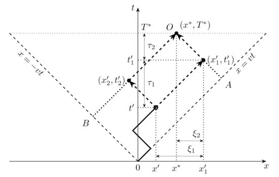 To find this probability, let us consider the process of a random walk. Suppose that the density needs to be estimated at the point at the moment of time (see Figure 1). We will consider symmetrical random walks . The particle trajectory begins at the point at the moment of time . Let the particle, as a result of a random walk at the moment of time , reach the point . To estimate the density at the point , it is necessary to calculate the probability of transition from the point () to the point . It is obvious that, to get from the point () to the point (), there are two possible alternatives of the trajectory continuation (see, Figure 1). The first option is to cover the distance in the positive direction of the axis . Then, to scatter at the point () and to cover the distance greater than in the negative direction of the axis . The second option is to cover the distance first in the negative direction of the axis . Then, to scatter at the point () and to cover the distance greater than in the positive direction of the axis . Since the particle is moving with a constant velocity all the time, then the paths and will take time and . The values of the paths and are determined by the formulas: