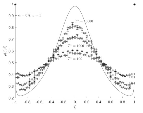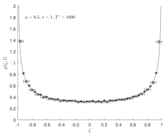 In Figure 2, the results of the numerical solution to the Equation (25) are given for the values , . Circles show the results of the histogram’s estimation of the Monte Carlo method (32), asterisks are the results of the local estimate (35) and the solid line is the solution (26). The calculation results are transformed for the variable with the help of transformation , where . As we can see from the figure, at the value , the results of all three solutions coincide. The figure also shows the advantages of the considered solution method. The results of the local estimate (35) do not contain the horizontal component of the error, which is present in the histogram estimate of the Monte Carlo method (32) and is connected with a finite quantity of the interval . In view of the fact that the contribution from one trajectory to the point is calculated times, then this leads to a decrease in the statistical (vertical) error. In the figure, the magnitude of the statistical error does not exceed the size of the symbol. It should be noted that the solution (26) is an asymptotic solution and describes the distribution of particles at . As we can see from the figure, in the case and time , the results of all three methods of solution coincide. This means that the process of the random walk of a particle has already entered the asymptotic regime. However, the moment when the random walk process enters the asymptotic regime for different values is different.