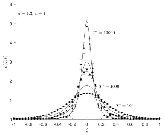 The solution to the kinetic equation for the case and specified values is given in Figure 4. In this figure, the points are the results of solving the kinetic Equation (20) with the use of the local estimation method, the solid curve is the solution (30). As in the previous cases, the calculation results are given for the variable , where . The figure shows that, at times and , the random walk process has not yet reached the asymptotic regime. The asymptotic regime of random walks is reached at . As one can see, for a given time, the asymptotic solution (30) and the local estimation results are in good agreement with each other.