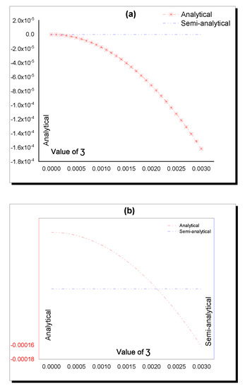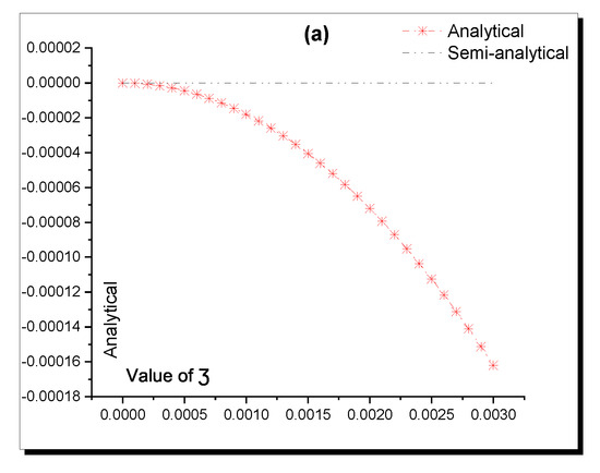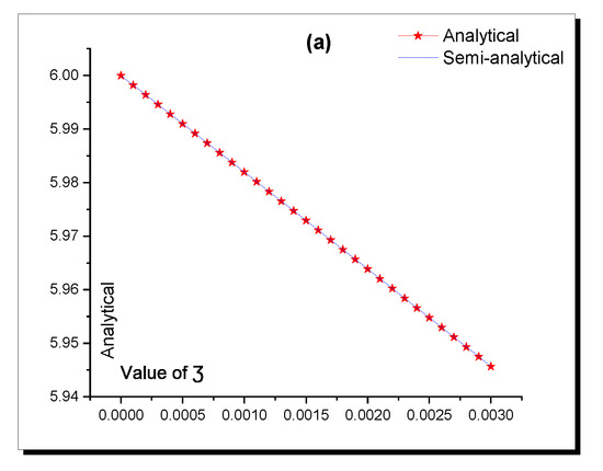 The following Table 1, Table 2, Table 3, Table 4, Table 5 and Table 6 show the values of analytical, semi-analytical, and absolute error through .
