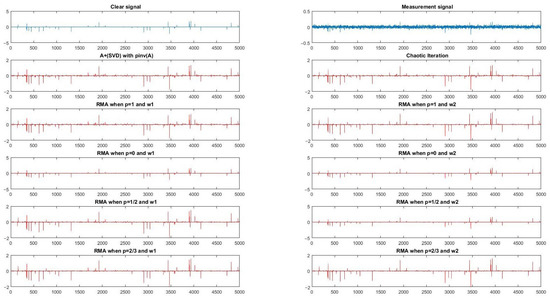 Subsequently, we chose of large size . Corresponding to stochastic signals, the signal reconstructed by Iterative Figure 1 with and when ,1, (4) based on (SVD) and Chaotic Iteration are displayed in Figure 2. The measurement signal is plotted in Figure 2, where . For two groups of parameters, we randomly chose some groups of different numerical experiments and listed the results in Table 1 and Table 2, respectively.