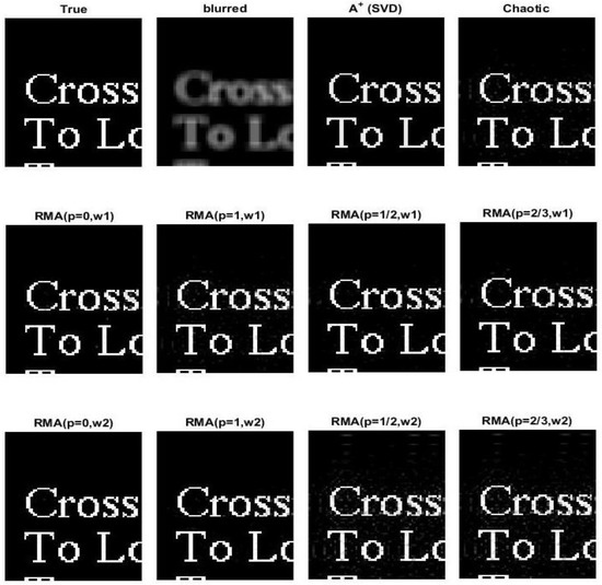 Deblurring results of the Bregman iteration, Chaotic iteration and RMA with , , when ,1 for a 64 × 80 part of the sparse Words image convolved by a Gaussian kernel and contaminated by a Gaussian white noise of .