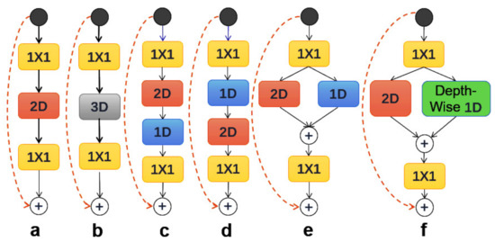 Figure 1a illustrates a C2D Residual Block (TSN [30] and Temporal Relational Reasoning Network (TRN) [31] belong to this category); Figure 1b shows a C3D network; Figure 1c indicates a cascade 3D network, which decomposes a standard 3D kernel with a 1D temporal convolution followed by a 2D spatial convolution; Figure 1d demonstrates a reversed cascade 3D architecture, which exchanges the order of temporal and spatial convolution in cascade 3D; Figure 1e displays a parallel architecture, which models the spatial and temporal information in two independent branches; Figure 1f shows a new channel-separate temporal convolution proposed to replace the standard temporal convolution in Figure 1e, named as DTP.