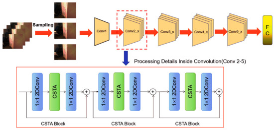 As mentioned in the above analysis, in order to achieve the effective extraction of temporal features and better fusion of temporal and spatial features, we propose a channel-wise spatial-temporal aggregation network (CSTANet, as shown in Figure 2). Intuitively, our CSTANet looks like a stack of CSTA Blocks. As shown in the Figure 2, after sampling the frames from a video, we adopt the same strategy as described in TSN [30]. Technically, the input video is first split into N segments equally and then one frame from each segment is sampled. In detail, we adopt the ResNet-50 [46] as a backbone, and replace the Residual block with our CSTA block.