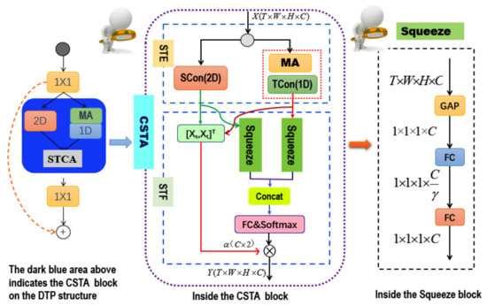 In the literature, both 3D convolution and a cascaded spatial-temporal convolution can only perform simple fusion of spatial-temporal features. Based on the results of literature comparison and feature extraction practices, we believe that the spatial-temporal information contained in different layers and channels of the network should be treated in a different manner. Among them, some channels may be more related to temporal information, and some channels may be more related to spatial information. Therefore, we propose a spatial-temporal feature fusion module (STCA), which is tightly coupled in temporal (T) and spatial(S). The structure is shown in Figure 3. For the output feature maps of spatial convolution and temporal convolution and , where and , both are fed into the Squeeze module. The Squeeze module consists of a global average pooling layer and two consecutive fully connection (FC) layers. First, we process and to obtain and by the global average pooling, which is followed by two consecutive fully connected layers (FC). Among them, in order to reduce the number of parameters, the first FC layer is configured with the number of channels to the original . In the experiments, we take . The output of the Squeeze module is and . Finally, we concatenate to form S, followed by a FC layer and Softmax for activation in each row. That is, the temporal and spatial features in each channel obey a probability distribution as a whole, and within a channel, the spatial-temporal features form a competitive relationship. Formally,