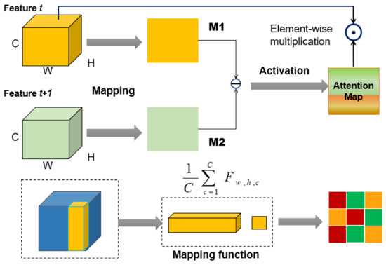 Given an input , , the proposed MA module is mainly divided into three processing steps. As an illustration, we select the t-th frame and the (t + 1)-th frame as inputs. As shown in Figure 4, a mapping function is first used to map a 3-D tensor to a 2-D tensor, which is based on the statistic of activation tensors across the channel dimension. Next, we make an element-wise subtraction between adjacent frames with an activation function followed to get an attention map for frame t. Finally, the attention map is then multiplied in pixel-wise manner to the frame t’s feature, where ⊖ denotes element-wise subtraction, and ⊙ denotes element-wise multiplication. In detail, first we define the mapping function: