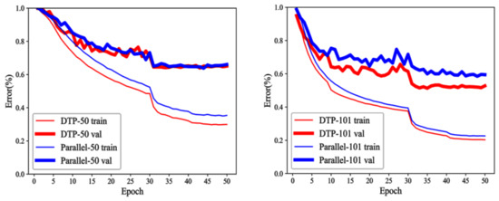 Training and testing errors for DTP and Parallel on Something-Something V1.
