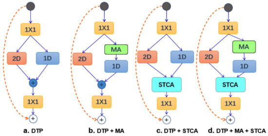 The four kinds of structure for ablation analysis. (a) DTP; (b) DTP+MA; (c) DTP+STCA; (d) DTO+MA+STCA.