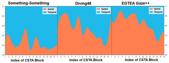In this section, we will analyze the characteristics of spatial-temporal feature distributed in each layer of the network and discuss the spatial-temporal feature contribution of different layers of the network. We use the attention weight calculated in each CSTA block to indicate the importance of the features. Figure 8 illustrates the spatial-temporal features’ distribution among all CSTA blocks based on ResNet-50. We can draw the conclusion that the temporal feature plays a very important role in Something-Something dataset. In contrast, on Diving48, the contribution of spatial and temporal nearly “half to half”. As for EGTEA Gaze++, the contribution of spatial surpasses that of temporal. We also can find that in all datasets, the contribution of temporal feature rises, while that of spatial declines from shallow blocks to deep ones. This suggests that our model tends to learn temporal representation in high-level semantic features, which has been verified by many previous works [25,33].