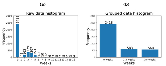 Histograms representing the distribution of data used in the research. In subfigure (a), we present the distribution of a fracture’s age over the weeks. In subfigure (b), we depict a histogram of the same data after grouping the data into three groups.