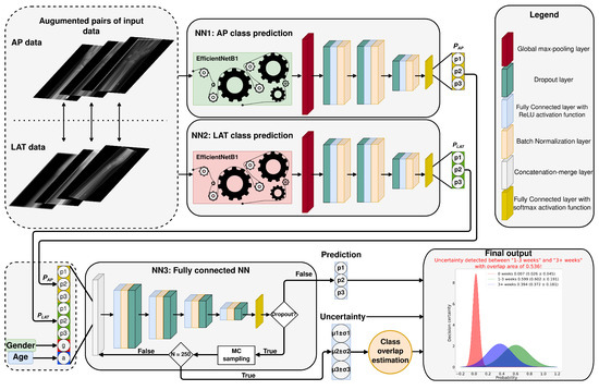 NNs are generally considered black boxes that lack explainability or any certainty over their decision [34,35]. There are two types of uncertainty: epistemic uncertainty and aleatoric uncertainty. Epistemic uncertainty is the result of limited data and knowledge, while aleatoric uncertainty arises from the stochasticity of observations. Since we cannot influence the input data, we are focused on estimating epistemic uncertainty. The Bayesian approach can be used to some extent to overcome the problem of epistemic uncertainty [36]. Namely, Yarin and Zoubin, in their paper [37] have shown that dropout can be used as a Bayesian approximation of model assembly. In other words, they have proved that a NN with dropout layers is mathematically equivalent to a Bayesian approximation of the Gaussian process [38]. With dropout, each subset of neurons acts as one of new NNs that are part of an assembly. Hence, every of the NNs in the assembly has its prediction that can be marked as . The process of generating new NNs can be seen as a Monte Carlo sampling from the original NN. As it can be seen in Equation 1, to obtain the uncertainty prediction for each of the three classes (—“0 weeks”, —“1-3 weeks”, —“3+ weeks”) we estimate the normal distribution defined with the mean and standard deviation of the sampled NNs. The and are given in Equations (2) and (3) respectively, and are calculated based on NN1 output , NN2 output , patient’s gender g, and patient’s age a.