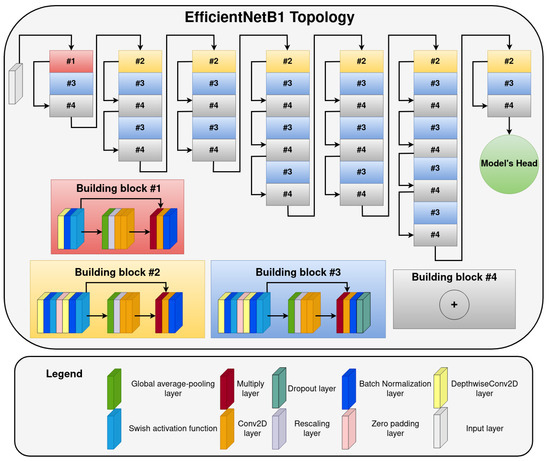 Figure 4. EfficientNetB1 topology. The topology is complex and more details about it can be found in the original paper [29]. - The second part of the proposed system is a fully connected NN (NN3) that takes as the input a vector (size ) created from the outputs of NN1 and NN2, and patient’s gender (g) and age (a). The topology of the NN3 can also be seen in Figure 3. It is constructed from four fully connected layers with 512, 256, 128, and 64 layers, respectively. Dropout rate in the dropout layers was the same as for the first part of the proposed system (). The output of NN3 is a final prediction of the fracture age from the assembly of features. Also, we have employed a decision uncertainty estimation algorithm, which we discuss in the following subsection.