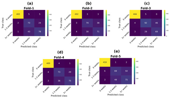 Confusion matrices depict the proposed system performance. The subfigures (a–e) shows confusion matrices for fold one, two, three, four, and five, respectively.