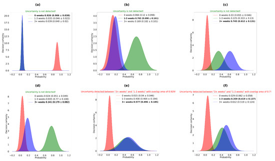 Next, we discuss the interpretability of the proposed system’s predictions. In Figure 6, we depict six scenarios from the perspective of model uncertainty. On the x-axis, we set the probability of the class, while the y-axis shows the decision certainty. In the scenario depicted in Figure 6a, the proposed system has “no doubts” in its decisions. The proposed system predicted class “0 weeks” with probability and a quite high certainty (correct prediction is printed in boldface in the subfigure’s legend). In subfigures (b) and (c), it can be seen that the proposed system gave correct predictions, but the uncertainty of its decision is more considerable than in subfigure (a). Namely, as the overlap between normal distributions representing uncertainty in two classes with the highest probability increases, we can assume that the model could make an erroneous prediction. We set the threshold for system reporting high uncertainty probability to , which means that the top two distributions overlap in over of their areas. By adjusting the mentioned threshold, we are setting up the proposed system sensitivity. For instance, in Figure 6e, the proposed system made a correct prediction but reported high uncertainty about it because of its overlap with another class in . On the other hand, in subfigure (f), the proposed system made an incorrect prediction, but due to the reported uncertainty (overlap of ), we cannot take its decision for granted. In both cases, we can conclude that we cannot be confident about the models’ prediction, but we can eliminate that the fracture is not a fresh one (0 weeks old) due to the model’s high certainty in that 0 weeks class prediction. Therefore, the system still helped by eliminating the one class. Finally, we need to be aware that the proposed system is not perfect; it can still make mistakes and drive completely wrong predictions with high certainty. This case is depicted in Figure 6d.