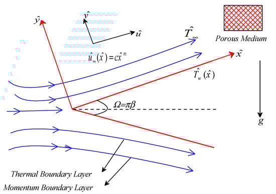 Here we concentrate on a 2D steady laminar silver-sodium alginate micropolar nanofluid flow via mixed convection and velocity slip cross a radiative wedge with angle Ω in a porous medium is shown in Figure 1.