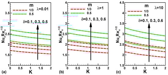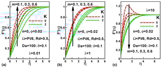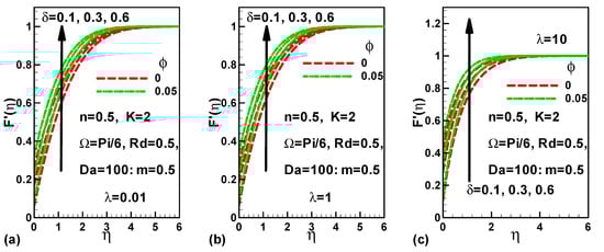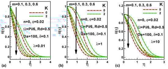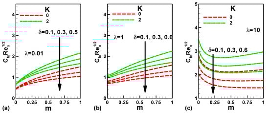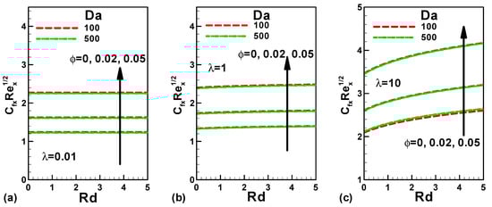 The variation of skin friction with pertinent parameters is demonstrated in Figure 8 and Figure 9 for Newtonian and micropolarnanofluid with weak concentrations. Figure 8a–c reveal that the skin friction is smaller for Newtonian fluids than micropolar nanofluid. The skin friction increases with the pressure gradient and micropolar parameters. However, the slip velocity parameter helps in reducing skin friction. For the special case of a flat plate (m = 0), the skin friction is lowest in the case of forced convection and increases with an increase in the Richardson number. Figure 9a–c depict the variation of skin friction with radiation and solid volume fraction of nanoparticles for different values of Darcy number. It is shown that Darcy number and radiation have no appreciable effect on the skin friction for the forced and mixed convection process (Figure 9a,b). However, in the case of free convection, skin friction increases with the radiation parameter.