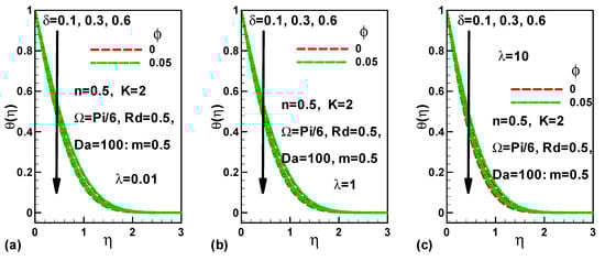 The effects of the velocity slip parameter and solid volume fraction of nanoparticles on dimensionless velocity are demonstrated in Figure 3 for forced, mixed, and free convection. An increase in the slip parameter or solid volume fraction of Ag nanoparticles causes an increase in the dimensionless velocity, which increases the hydrodynamic boundary layer thickness.Thus, the dimensionless velocity increases with both the slip velocity and the solid volume fraction of nanoparticles in each case, as shown in Figure 3a–c. The effects of relevant parameters on the dimensionless temperature are displayed in Figure 4 and Figure 5 for forced, mixed, and free convection, respectively. The dimensionless temperature decreases with an increase in the pressure gradient parameter for both Newtonian and micropolarnanofluid in each case. Consequently, the thermal boundary layer thickness as well as the thermal resistance decrease, as shown in Figure 4a–c. Due to the higher thermal conductivity of the nanoparticles, thermal boundary layers converge quickly for micropolarnanofluid (K = 2) in each case. The velocity slip and solid volume fraction of nanoparticles have a negligible effect on the dimensionless temperature for both fluids, as shown in Figure 5a–c for each type of convection heat transfer.